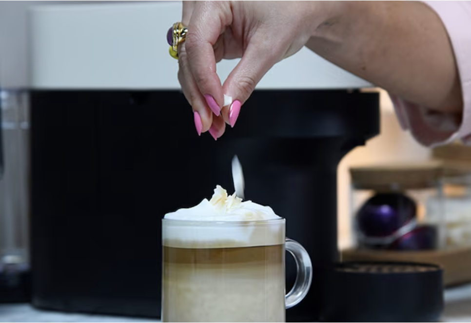 В устройство бариста добавьте молоко и кокосовый сироп и используйте кнопку Latte macchiato для вспенивания. Налейте молочную пену в кружку Vertuo
